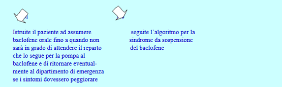 - se sono già presenti sintomi iniziali di sospensione del baclofene (prurito sena rush o spasticità e sudorazione) istruite il paziente ad assumere baclofene orale e di procedere al più presto alla verifica/ricarica della pompa